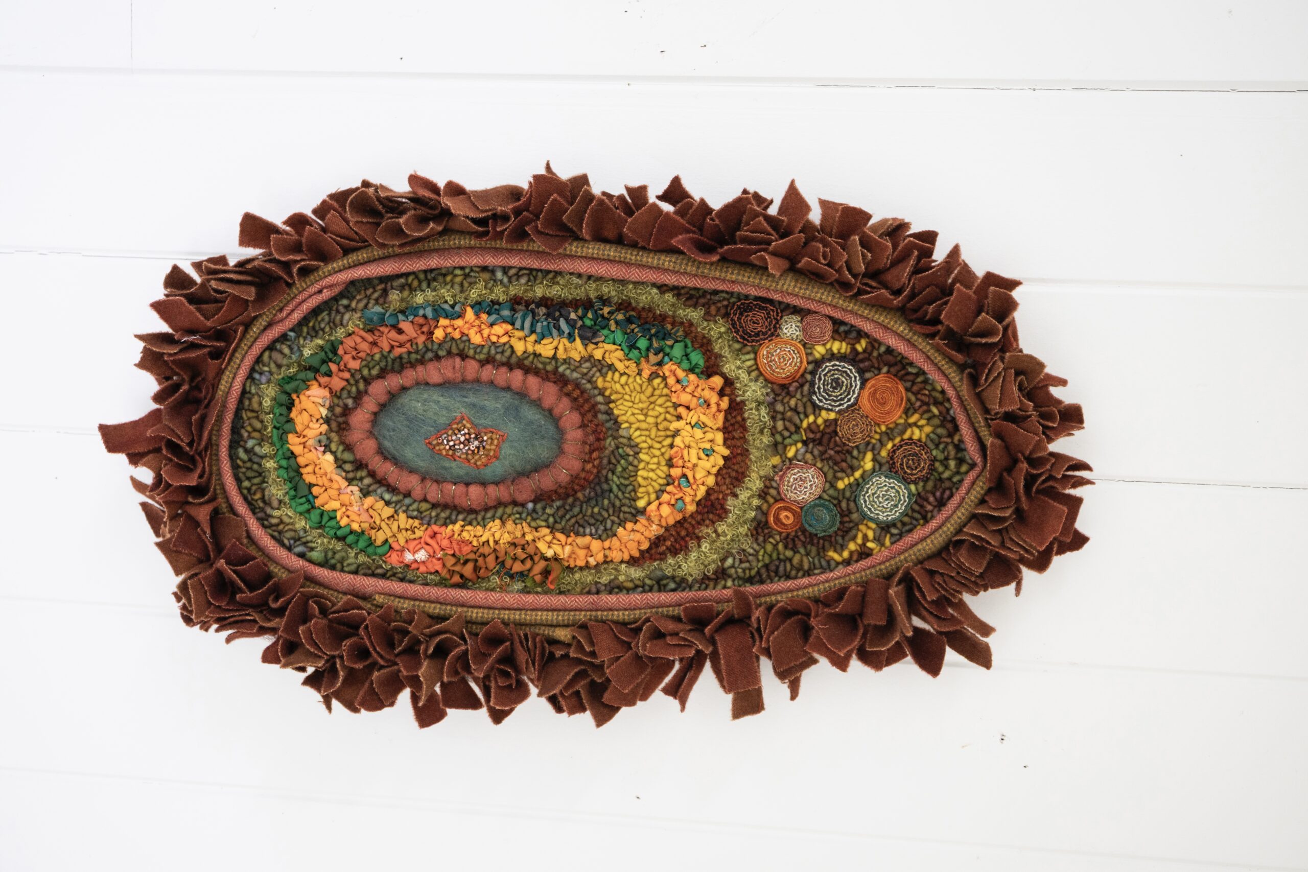 Students will use flexible copper pipe as a frame for their orb then stretch and stitch foundation cloth around the piping. A wide variety of techniques will be taught over the three-day class and students may choose which to incorporate in their piece. Techniques include wet felting, needle felting, quillies, standing wool, embroidery, beading, reverse punching, sculpting, and rug hooking with many different fibers. The piece will evolve organically from the center out. Students will also learn how to finish and hang their pieces.